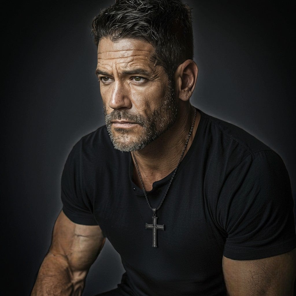 Homme portant un collier croix en acier, illustration de la section “Pourquoi choisir Just For God ?”