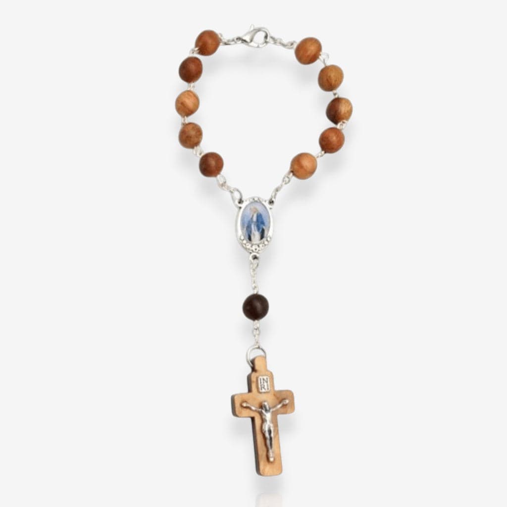 Le dizainier bois est fait pour l’homme sobre, fidèle, enraciné. Fabriqué en bois d’olivier, il porte en lui la mémoire du sol biblique, de la paix virile, du combat silencieux. Ce n’est pas un bijou. C’est un outil de prière. Une corde discrète entre ta main et le ciel.