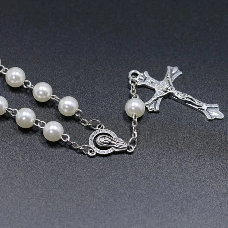 Avec une circonférence de 18 cm, il se glisse autour du poignet comme un bracelet de prière, discret mais toujours là. Son pendentif de 90 mm, en finition brun et blanc, ajoute de la profondeur à l’ensemble. Une croix visible, droite, qui affirme sans bruit.