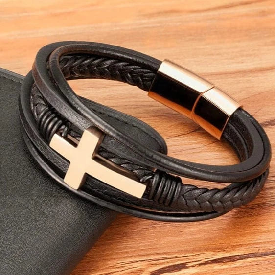 Ce bracelet cuir avec croix est fait pour l’homme qui marche droit, sans détour. Un homme qui porte sa foi non comme un slogan, mais comme une direction. Fabriqué en cuir véritable et acier inoxydable, il allie solidité, élégance et présence.