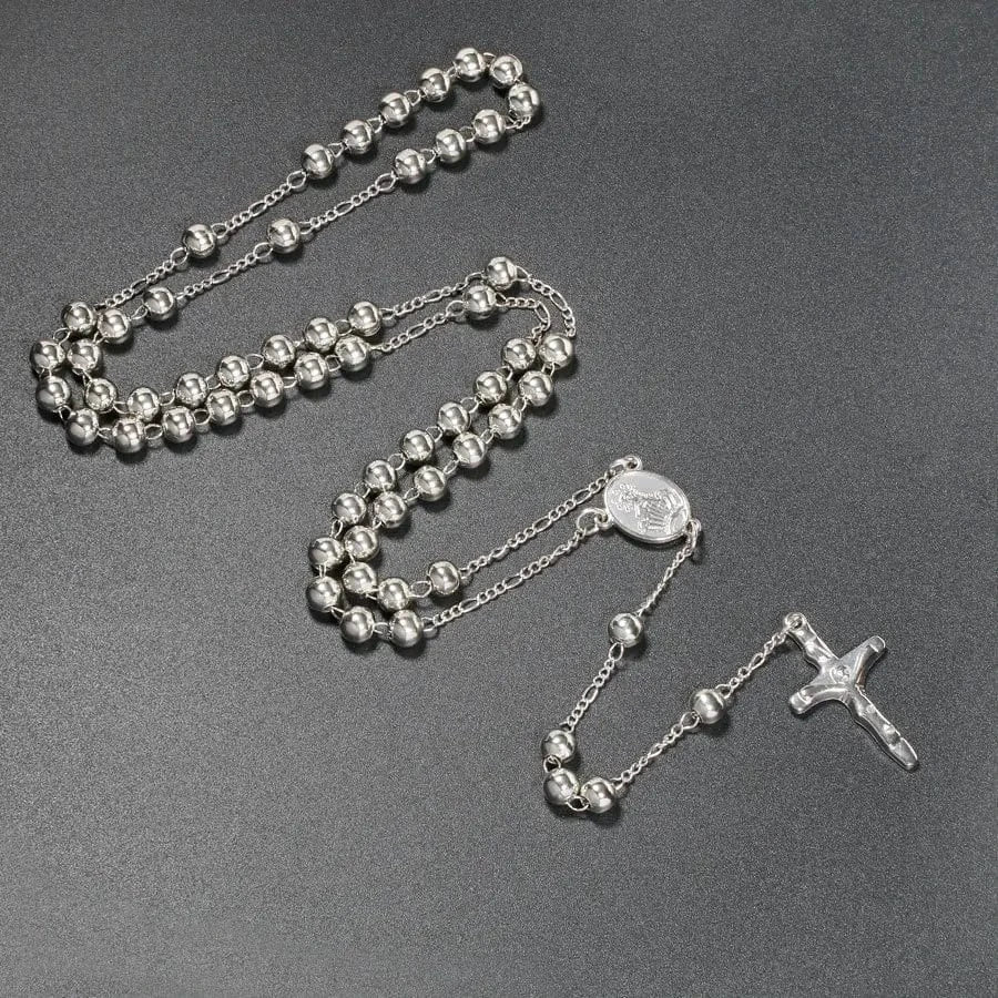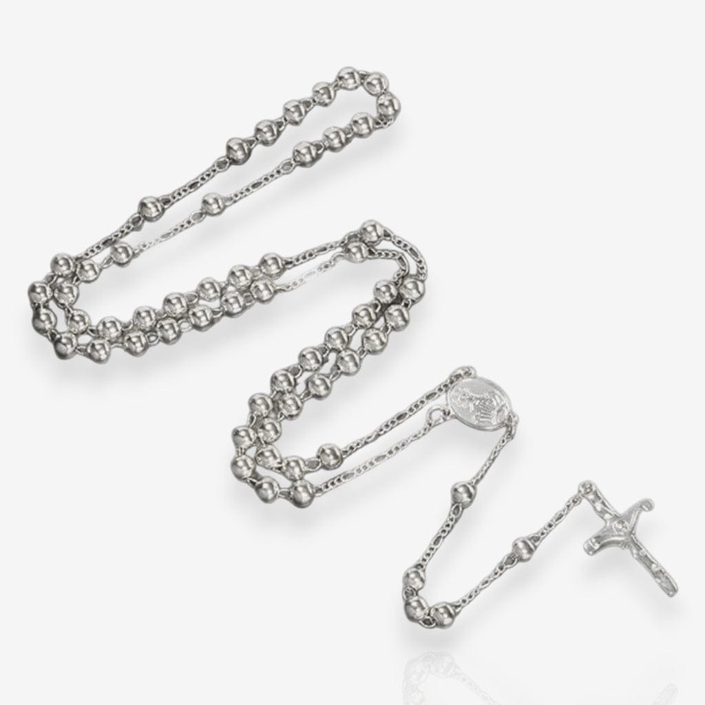Fabriqué en alliage d’étain, avec une finition argentée ou dorée, ce chapelet allie solidité et symbolique. Il résiste. Il pèse. Il tient. Il est fait pour les hommes qui n’ont pas peur de la gravité de la prière.