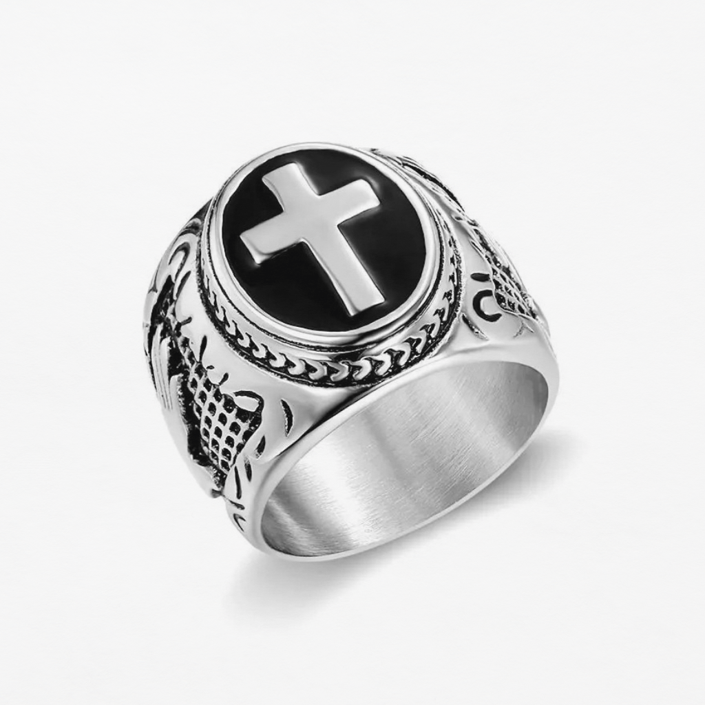 Cette bague avec croix ne cherche pas à séduire. Elle affirme. Sobre, virile, tranchante, elle est faite pour l’homme qui assume pleinement son attachement au Christ. Pas pour briller. Pour rester fidèle.