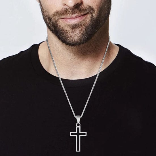 Homme portant un collier croix en acier, illustration de la section “Pourquoi choisir Just For God ?”