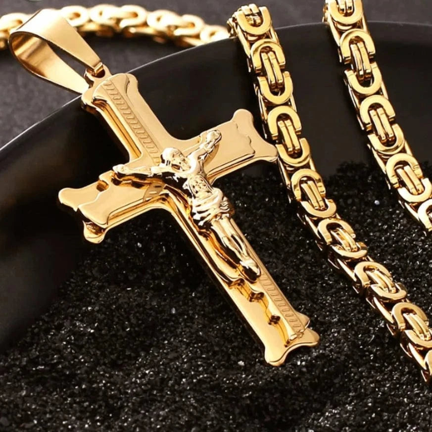 Le Collier Croix Doré en acier inoxydable est l’expression lumineuse d’une foi affirmée. Pensé pour l’homme chrétien qui n’a pas peur de porter la croix avec force et distinction, ce bijou capte le regard tout en honorant le Christ.