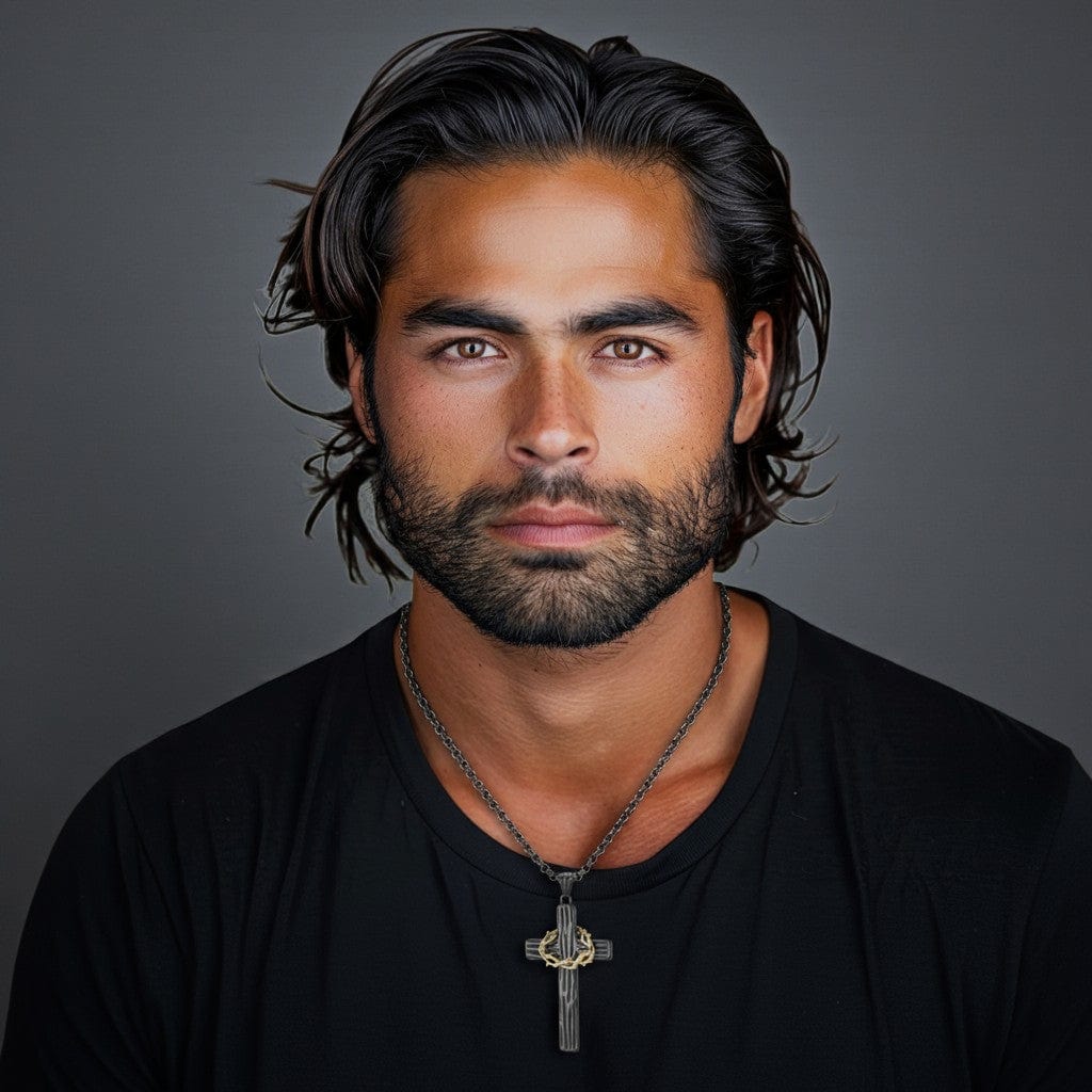 Homme portant un collier croix en acier, illustration de la section “Pourquoi choisir Just For God ?”