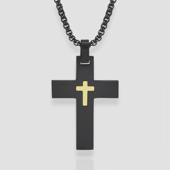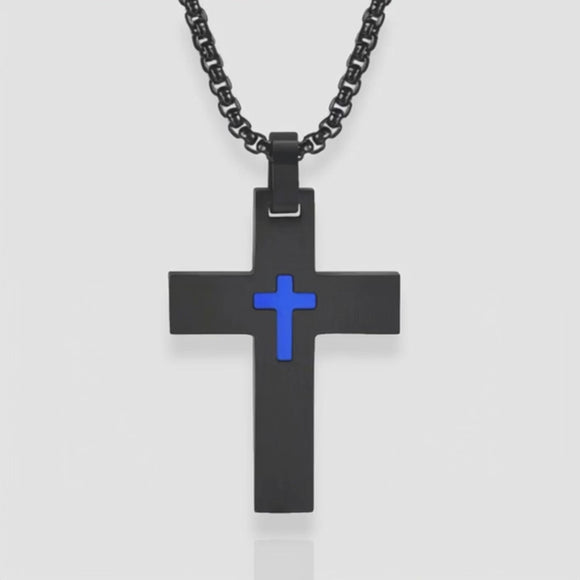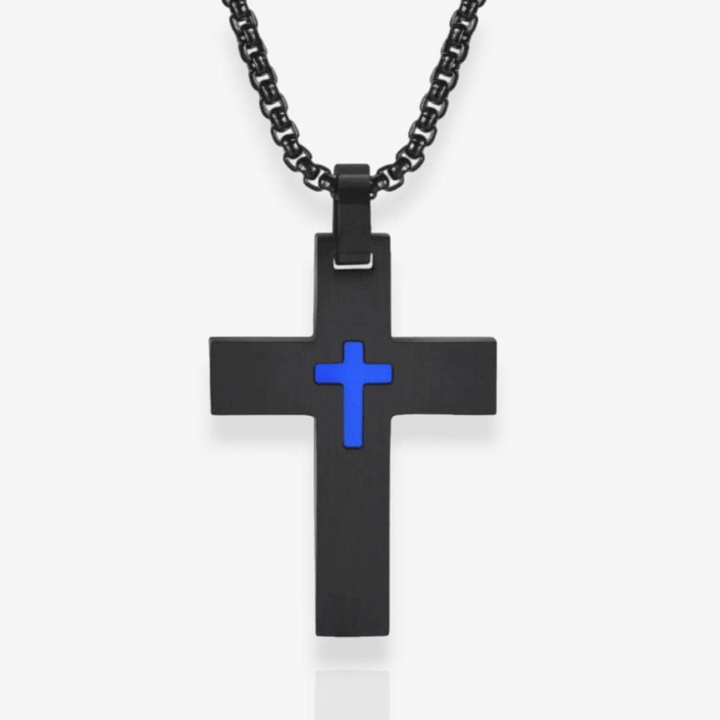 Le pendentif de 42 x 30 mm se compose de deux croix aux couleurs contrastées — doré et bleu — créant un effet visuel remarquable tout en conservant une forte signification spirituelle. Porté sur une chaîne ajustable de 50 à 60 cm, il s’adapte à ta morphologie et à ton style, qu’il soit discret ou affirmé.